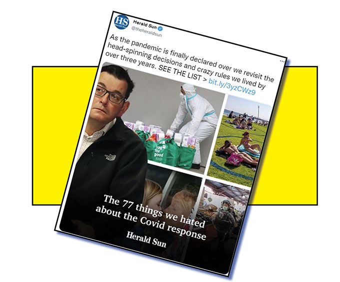 Doubt this? At top is their social media plug this week for a series the paper is running as they proudly – yes, proudly, go figure – boast about the 77 times they’ve tried to undermine Victorian Premier Daniel Andrews and his government’s actions in dealing with COVID-19 over the past two years.