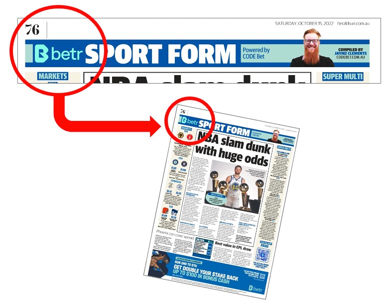 The ads appeared to reach a crescendo yesterday with Betr ads sprinkled throughout many Murdoch turdbloids starting with a strip ad across the front pages of those serving the nation’s biggest media markets. (below)