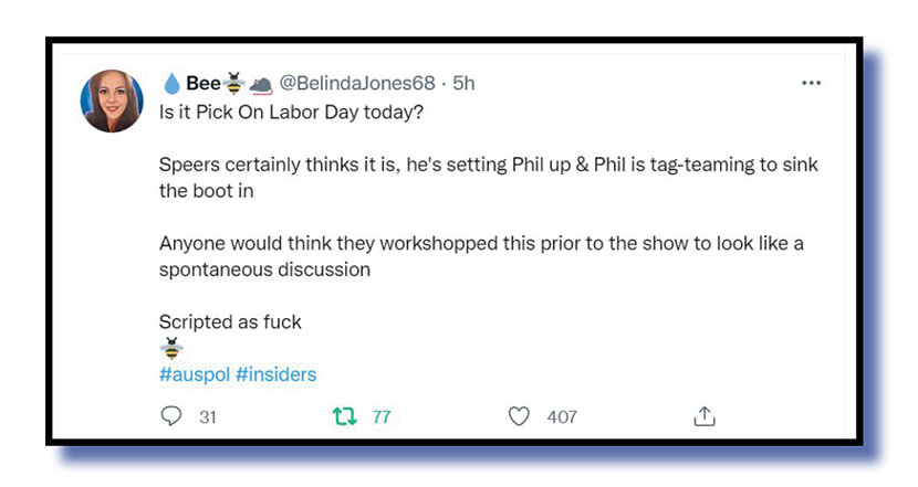 And seeing it also comes out of Melbourne, let’s turn our attention to the ABC Insiders program, and what Bee @BellindaJones68 thought of Sunday’s program…..
