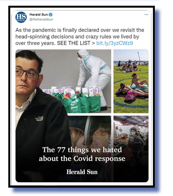 The propaganda shitsheet that the Herald Sun now is, and mindful that the state poll is nigh, is clearly anxious to do as much damage to the government as possible over the next six weeks, proudly revisited the “77 things we hated about the Covid response” (below).