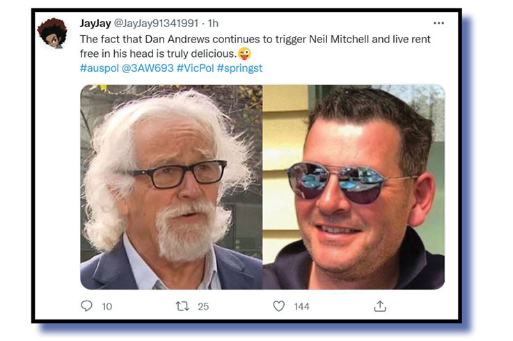 Entries were of the usual high standard but our judges finally went for a wonderful contribution by JayJay @JayJay91341991 (above and below) who presented us with the tantalising prospect that regardless of anything else Victorian Premier Daniel Andrews might do, the vicious bastard likes nothing better than to play mind games with 3AW rightwing nutjob Neil Mitchell.