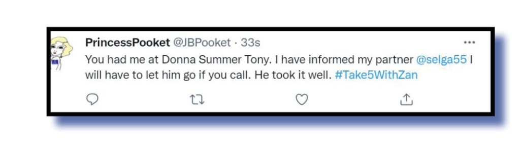 Let’s finish off now with affairs of the heart. Our judges were touched by this contribution from PrincessPooket @JBPooket after a certain well-known and popular ABC sports presenter appeared on some show where he talked about his five favourite songs.