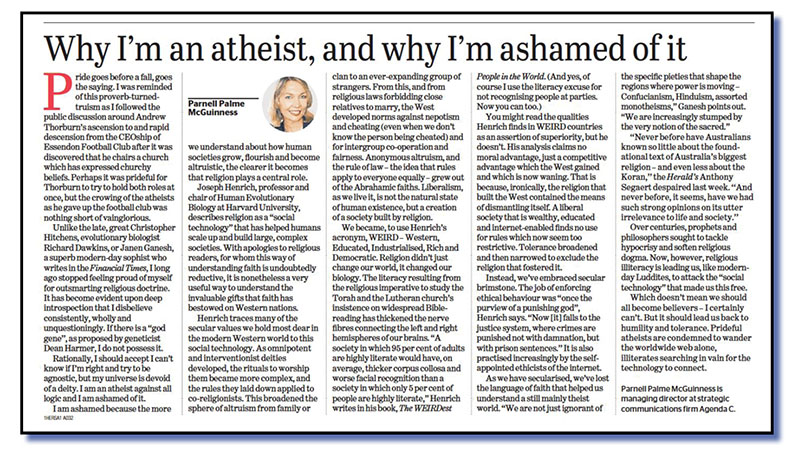 But the main bloke whose brilliance she bows to is Joseph Henrich, professor and chair of Human Evolutionary Biology at Harvard University, who “describes religion as a ‘social technology’ that has helped humans scale up and build large, complex societies”.