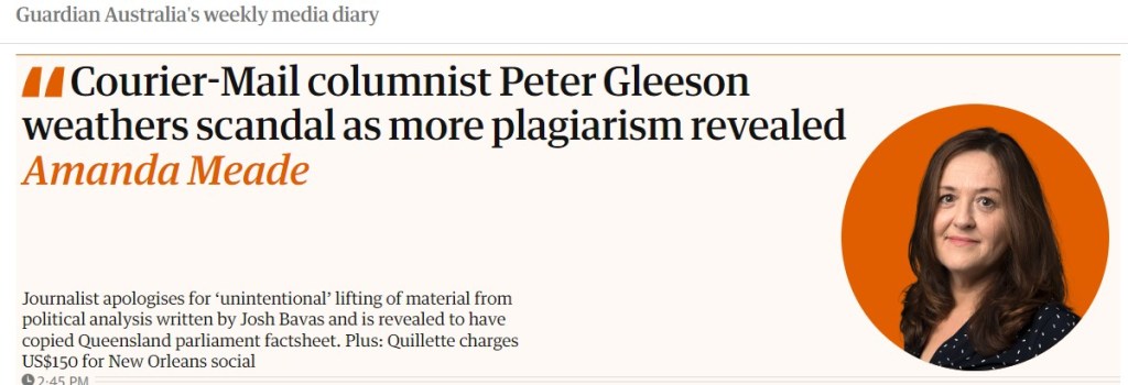 “The revelation comes after Gleeson was caught lifting four paragraphs of political analysis by the Brisbane reporter Josh Bavas, who wrote his piece for the ABC in 2020 when the deputy premier Jackie Trad stood down from cabinet.