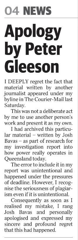 The Bug generally and its Media Glass House has been having a bit of fun with our old mate “Gleeso” of recent times so in the interests of fairness, we reproduce below his statement in The Courier-Mail during the week of the plagiarism contained, wilfully on purpose or purely by accident, in his 12-page hit job on the Palaszczuk state government.
