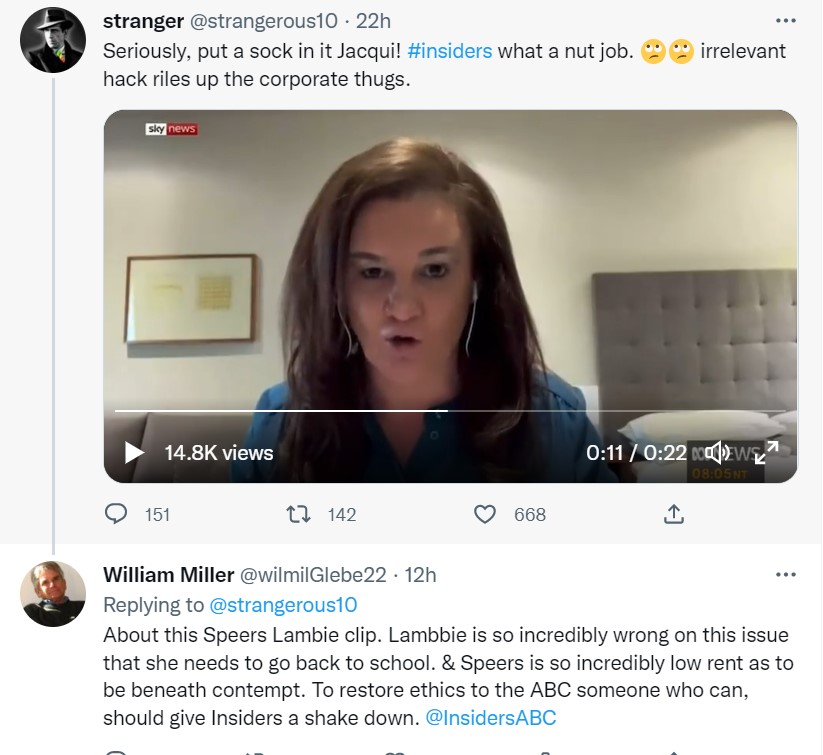 These words from rightwing nut job, ex-army jerk Jacqui Lambie – yes, the Tasmanian senator who’s almost a stupid as Pauline Hansen but can speak better – lit up Twitter especially after the unsound bite was used on the ABC Insiders program.