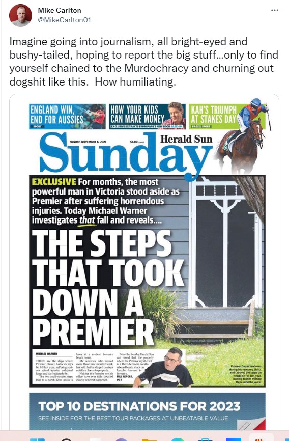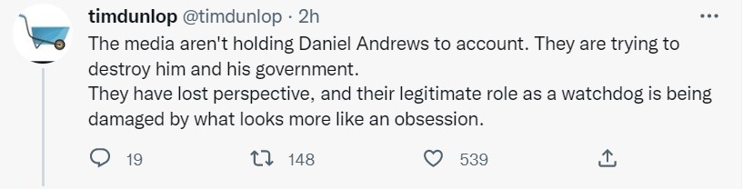 We now come – very, very sadly – to the issue that swamped the tweet-of-the-week barrel this week – the disgraceful, shameful, totally one-sided pile-on of the Daniel Andrews Victorian Labor government by former newspapers the Herald Sun and The Age.