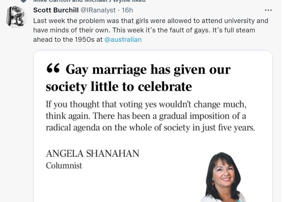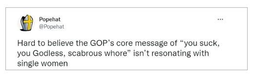 While our TOTW shortlist usually focuses on the views of Aussies, we just had to include this one by US lawyer and social commentator Ken White as @Popehat which crystallised one theory about why the US Republican Party did so badly in this month’s mid-term elections where exit polls showed almost 70% of unmarried young women backed the Democrats.