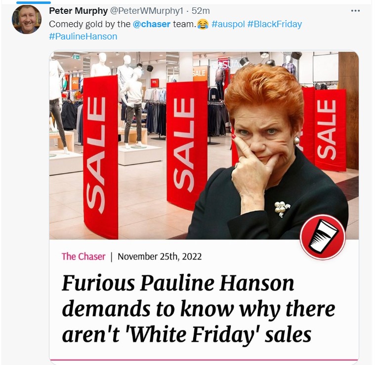Thursday’s effort by The Bug was most likely not the first time Black Friday sales have been roped in to take a swipe at Aunty Pauline and her white indigenous One Nation mulletandsmallchips tribe that settled in the Ipswich region in the distant dreamtime.