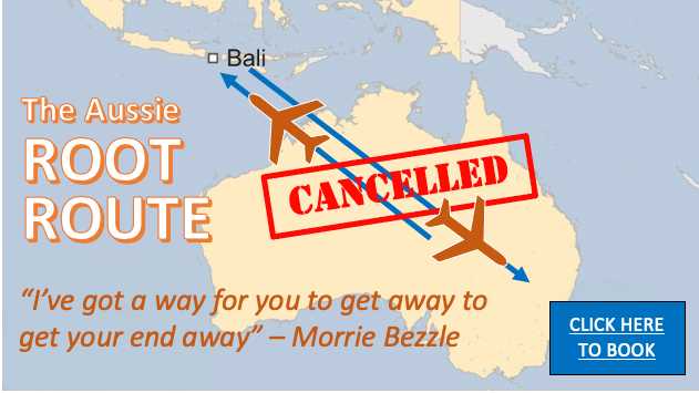 One advertisement alleged that “Bali is going out with a bang, and so should you” while another displayed a map showing Bali in relation to Australia with a “cancelled” return flight path labelled as a “root route”. (main picture)