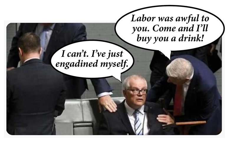 At top is my favourite image from 2022, the one where Morriscum’s parliamentary mates are comforting him after that naughty Labor Party used its numbers in the House of Representatives to censure him for promoting himself secretly to a handful of ministries.