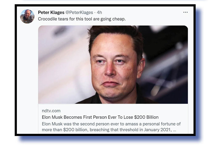 Peter Klages had a dig at Elon Musk’s uncanny ability to lose billions while Anna had a go at the Lying Rodent and The Australian.