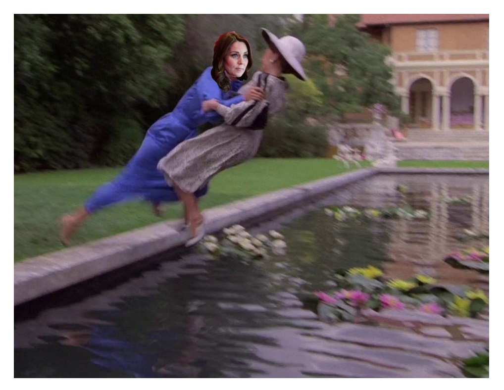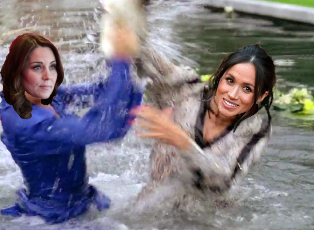 Quickly snapping a photo on my phone camera I caught the Duchess of Cambridge playfully nudging the Duchess of Sussex into the palace swimming pool (below).