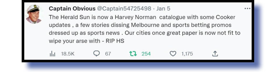 Captain Obvious sadly advised his Twitter followers that his arse has seen the last of the Herald Sun.
