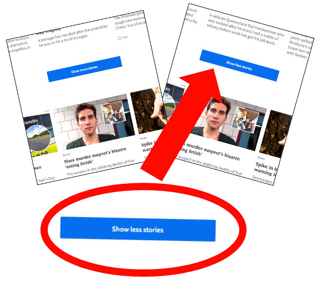Perhaps, our researcher asks, someone at News Crap Australia could insist on the use of correct grammar and change the “show less stories” to “show fewer stories”? Just a suggestion.