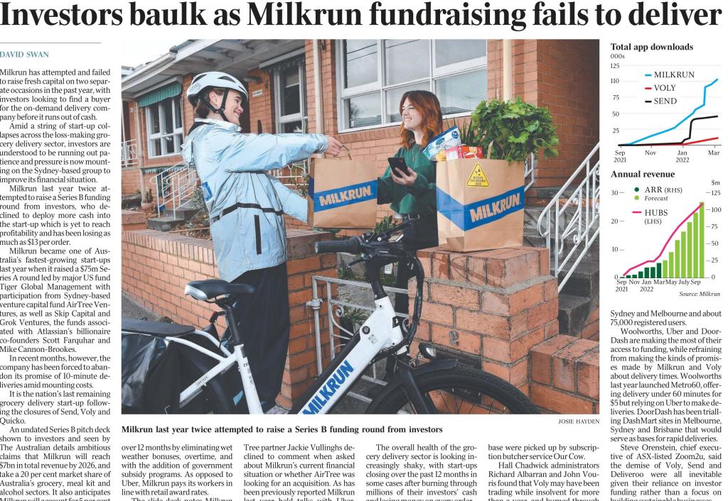 Milkrun is reportedly seeking a cashed-up buyer after several failed capital raisings and a decision to scale back its initial promise of delivering customer orders within 10 minutes. (below)