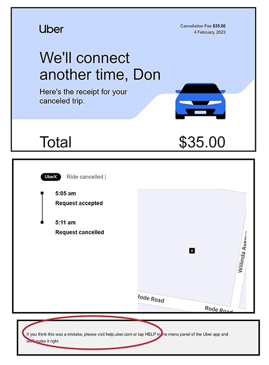 Not long after that, my email inbox has Uber telling me they’ve stolen … sorry, extracted … a $35 cancellation fee from my credit card.