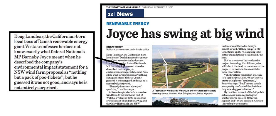 Doug Landfear, the Californian-born local boss of Danish renewable energy giant Vestas confesses he does not know exactly what federal Nationals MP Barnaby Joyce meant when he described the company’s environmental impact statement for a NSW wind farm proposal as ‘‘nothing but a pack of poo-tickets’’, but he guessed it was not good, and says he is not entirely surprised.