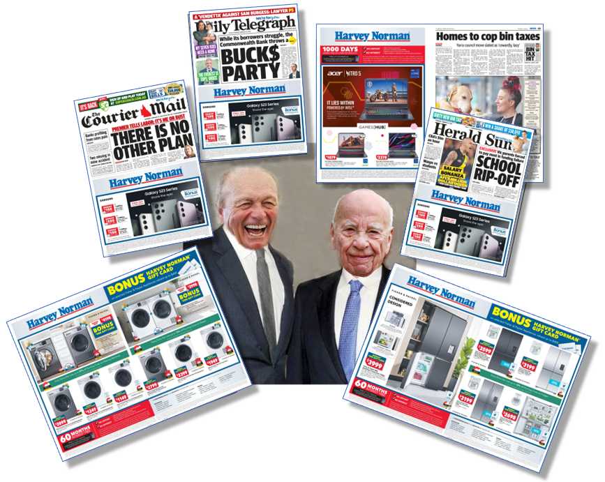 Could it be that Gerry Harvey’s retail chain and Rupert Murdoch’s outlets (main picture) are locked in a death spiral, with one’s poor reputation affecting, or even infecting, the other and ultimately guaranteeing the demise of both?