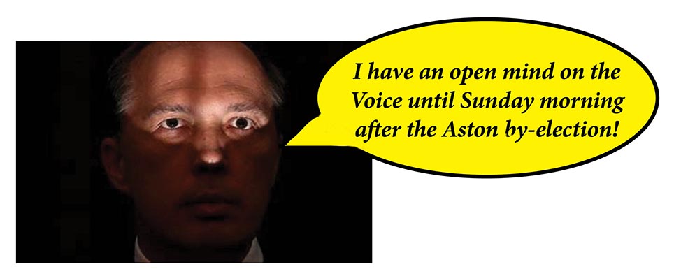 The Spud with Dead Eyes had apparently decided to wait until after the Aston poll before declaring the Liberals’ hand on recognition of first nations people in the Constitution and providing them with an advisory body to speak to parliament on matters that affect them.