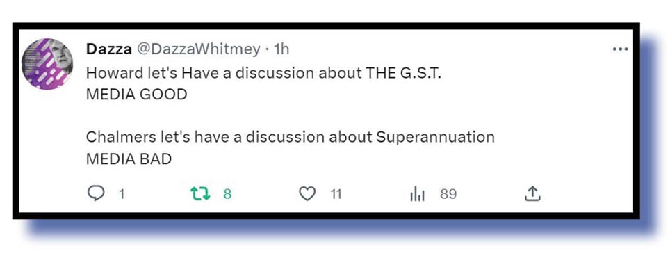Dazza used the GST to also have a dig at the mainstream mediocre over its faux super outrage.
