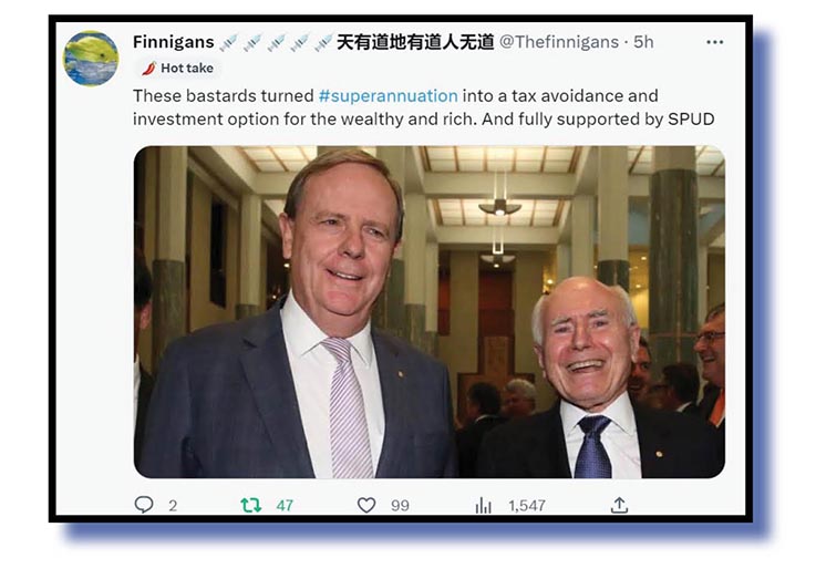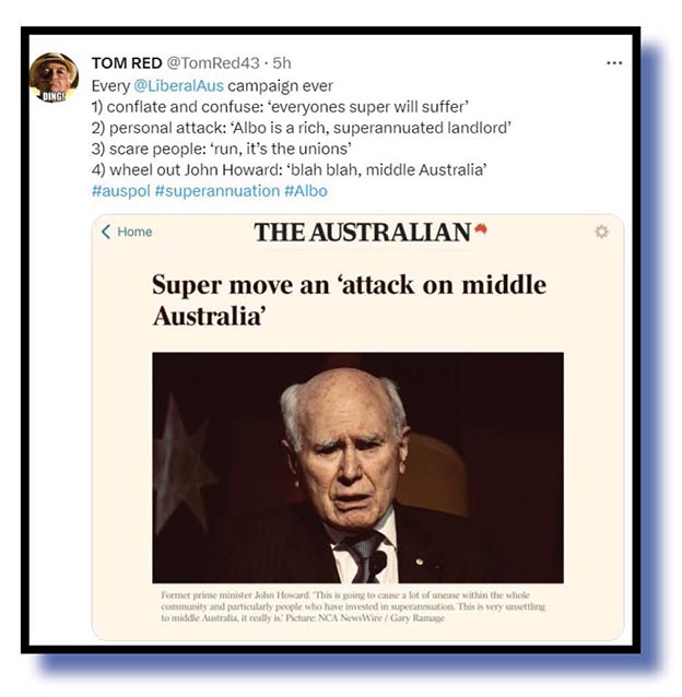 … while Finnigans, TOM RED and Rob White referenced the roles Peter Costello and John Howard played in creating the superannuation mess Labor might now have the guts to clean up … a little bit at least.