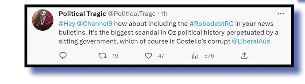 On that latter matter first, our judges saluted joan kunze (above and below) for her excellent summary of how the ABC and Newscorpse would have covered the Robodebt RC had it been a Labor scandal. Joan adds “et al” to her list of villains and we’ll assume she means, among others, Nine Entertainment Co. – aka Newscorpse Lite – and its Herald mastheads and radio shockjocks.