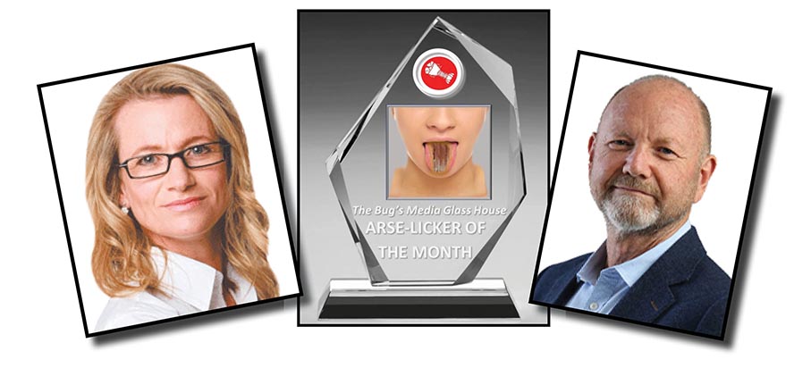 As expected, The Bug’s Media Glass House Arselicker-of-the-Month of February award has gone to The Australian‘s Janet Albrechtsen and Stephen Rice for a creative writing display that the award judges unanimously declared to be “vomitously illogical and yet somehow a work of such brownnosing beauty that it almost deserves praise”.