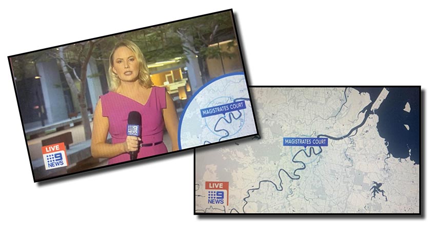 At right above is the full-screen image from Channel Nine’s news out of Brissie last night showing unexactly where the Brisbane Magistrates Court is! If your car doesn’t have sat-nav and you need to travel to those courts in the Brisbane CBD any time soon, simply print out that image and you won’t be there before you know it.