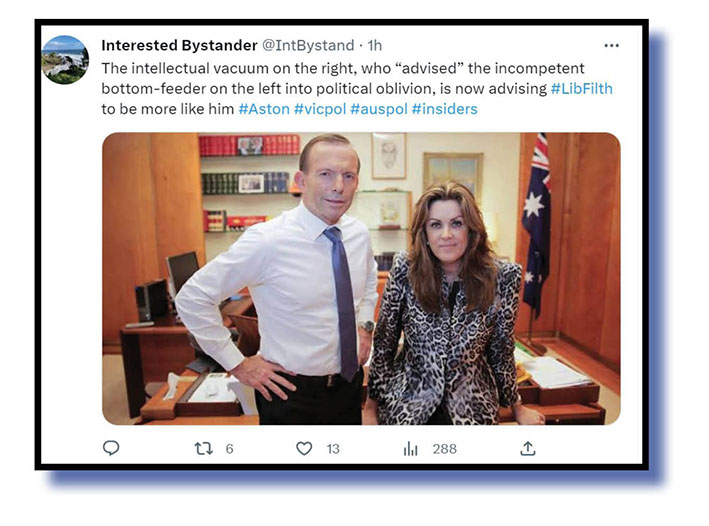 … while Interested Bystander had a lovely dig at Peta Credlin and the man she made what he is today … a fucking laughing stock of a failed PM.