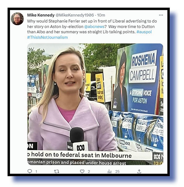 And we finish off with Mike Kennedy’s tilt at the ABC over its Aston poll coverage, both the visual presentation and what he clearly saw as unbalanced reporting.