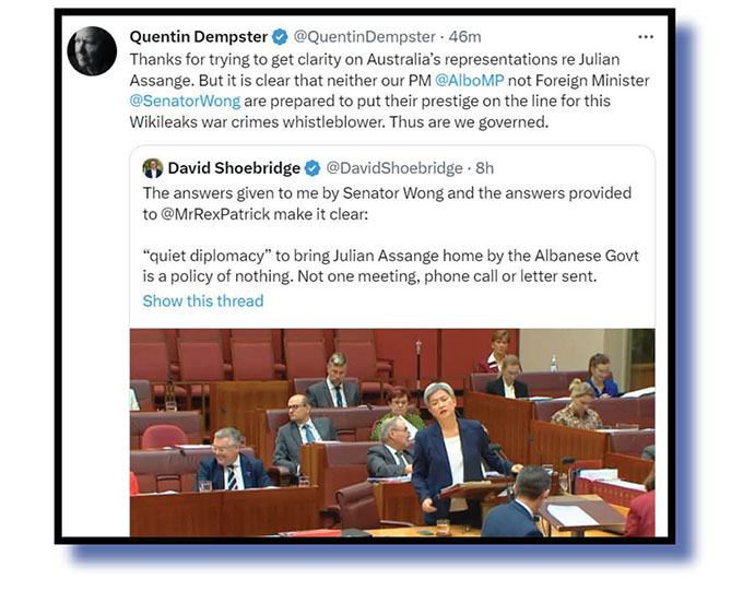 … and Quentin Dempster and David Shoebridge shared similar views on whether the supposedly centrist/leftwing government of Anthony Albanese will ever do the right thing by Julian Assange before it’s too late.