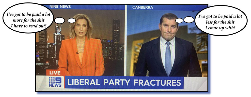 We start with her beginning summation of the night’s main news items: “Divided by The Voice, another Liberal frontbencher has quit over the party’s rejection of the referendum..”