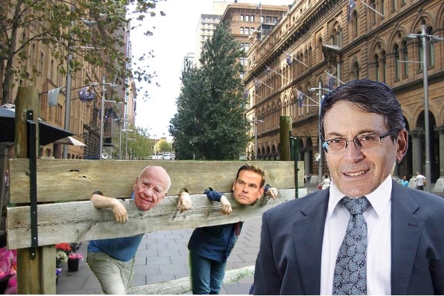“Both men are now detained in Martin Place in Sydney (main picture) where we will be holding them as long as it takes for Crikey subscribers and anyone who gave money to the fighting fund to come down here and exercise their right to freely express their opinions to both men in any way they see fit.