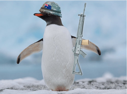 “Australians would not feel as secure if they knew that our entire Australian military deployment in Antarctica consists of a penguin formerly from Melbourne Zoo who was given rudimentary weapons training for just a week at Anglesea Barracks in Hobart. (main picture)