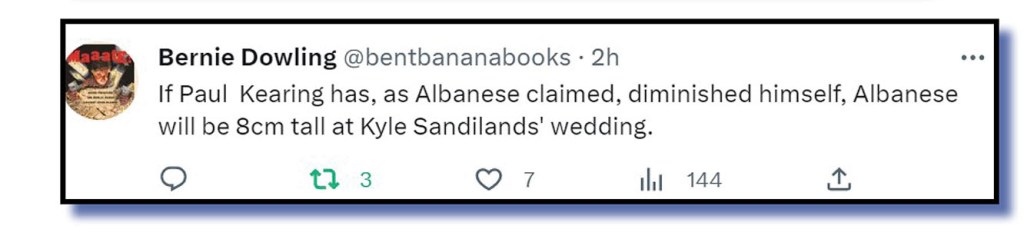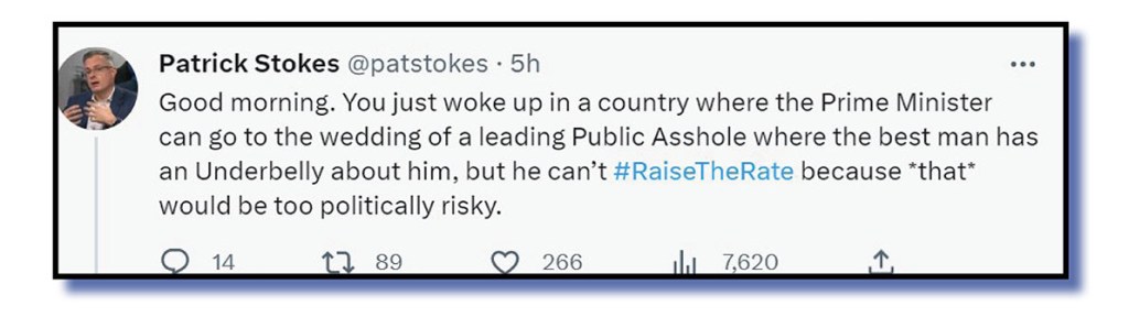 Now, of course, when a supposedly left-wing prime minister ends up acting almost as rightwing as an LNP one (okay, some would argue even more), Albanese is going to cop stick for all sorts of things, even going to a wedding. Take it away, Bernie Dowling and Patrick Stokes, the latter cleverly alluding to “that rate” again.
