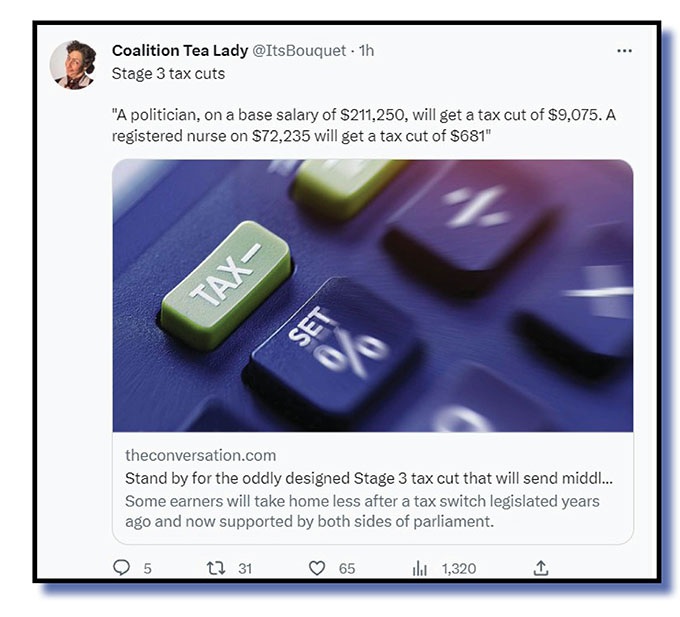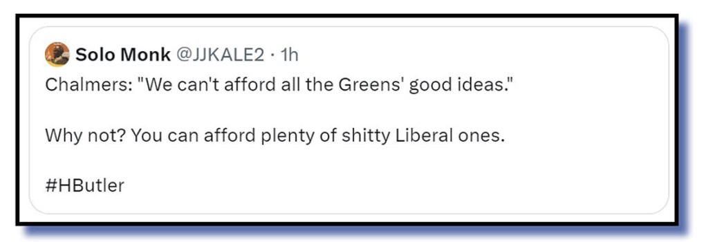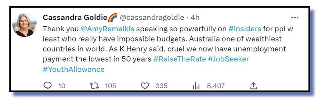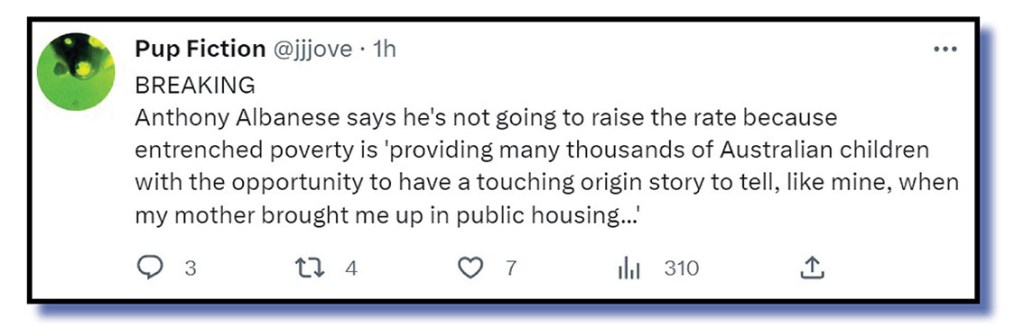 The rate referred to is, of course, the dismal, poverty-inducing Jobseeker rate that Albanese and Treasurer Jim Chalmers could have increased a week after coming to power by pointing the Morrison government’s cooked books at the camera and with humble, apologetic faces, declaring the Stage 3 tax cuts dead, buried and cremated.