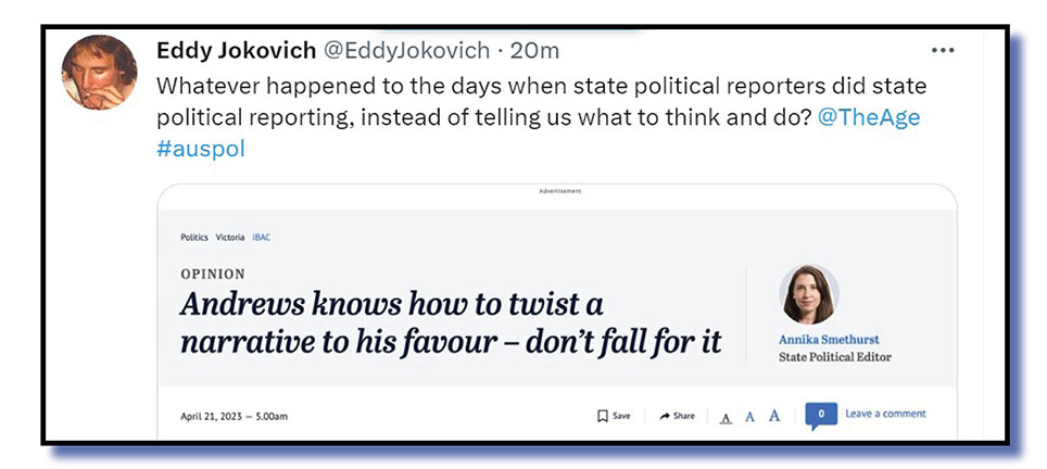 Our tweets-of-the-week judges could not agree more with the sentiments expressed above and below by highly respected retired journalist, multi-Walkley Award winner and Australian Media Hall of Famer Tony Koch.