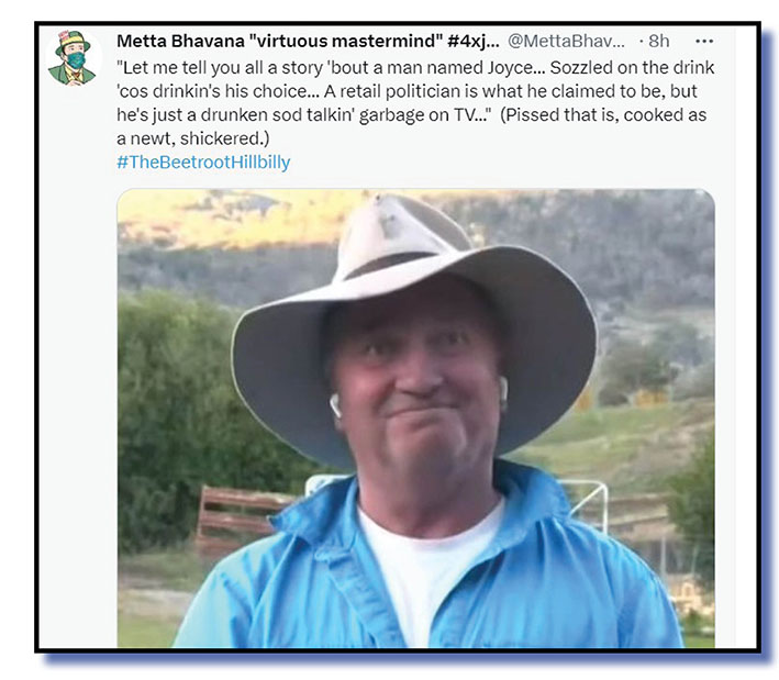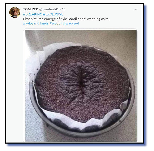 All very depressing, right? So let’s have a few moments of light-hearted fun where we poke fun at Barnaby Joyce and revisit that Kyle Wotisname wedding. Welcome back TOM RED and Metta Bhavana etc etc.