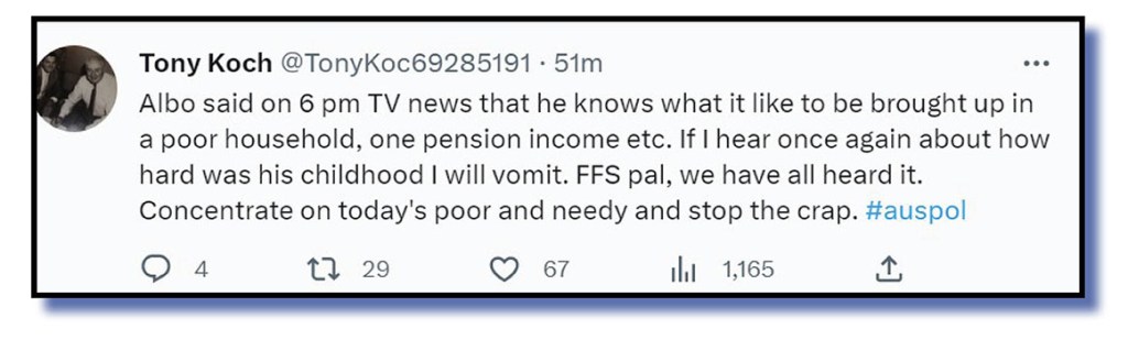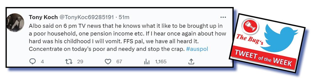 In the same vein, we selected this tweet from Pup Fiction, one of a number who riffed on the notion that Albanese is deliberately making the poor suffer so they’ll have a success story like his to tell one day! Marvellous stuff, as Richie used to say.
