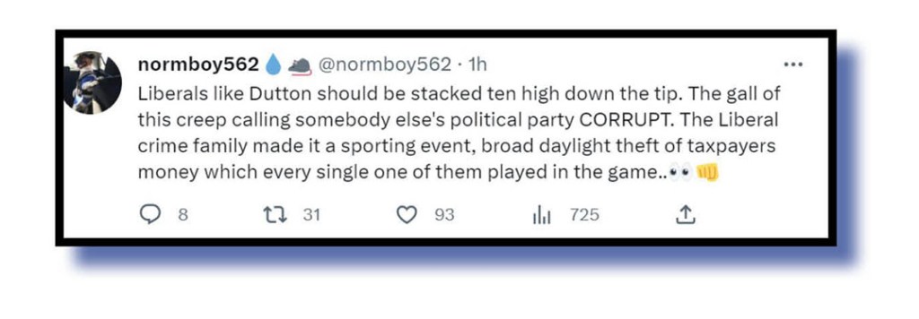 normboy562 also fired away at Dutton, who in an interview with the ABC’s Patricia Karvelas managed to call Victorian Premier Daniel Andrews and his government corrupt at least four times. While Karvelas was pinged by the Twitterarti for not pulling Dutton up, others lauded a shock tactic clearly designed to draw attention away from the fact that the Victorian Liberals are trying their damnest not to be a viable alternative government for at least the next decade. Or two.