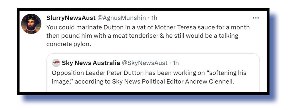 The Dudster Spudster, aka the federal Opposition Leader, continues to draw flak on The Bug‘s twitterfeed and SlurryNewsAust threw together some wonderfully creative and image-shaping words.