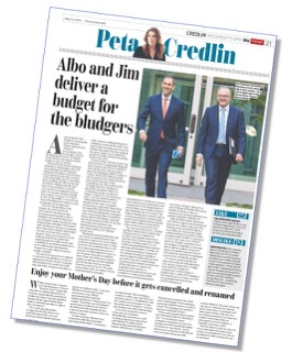 Speaking of the Murdoch media – which we weren’t but often do and will again right now – here’s the key take-out of the federal budget “analysis” written by one of its well-promoted, well-heeled, and well-rewarded employees. (main picture)