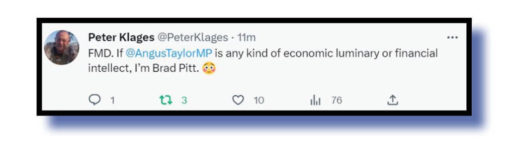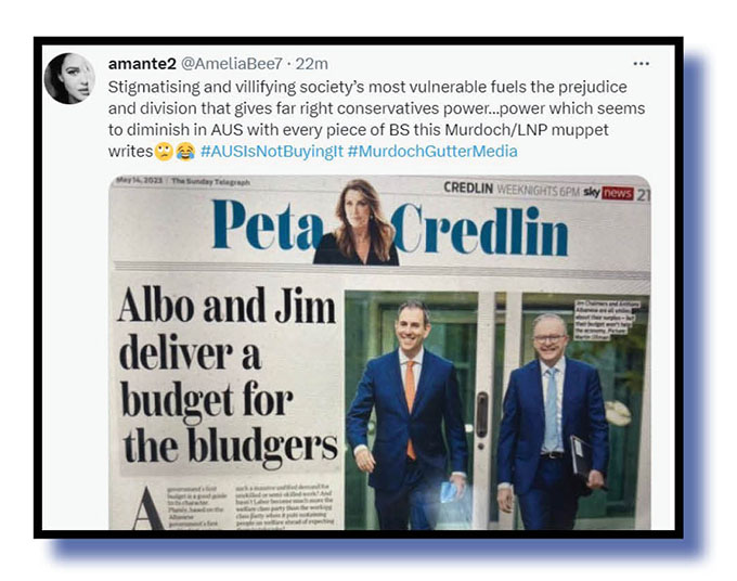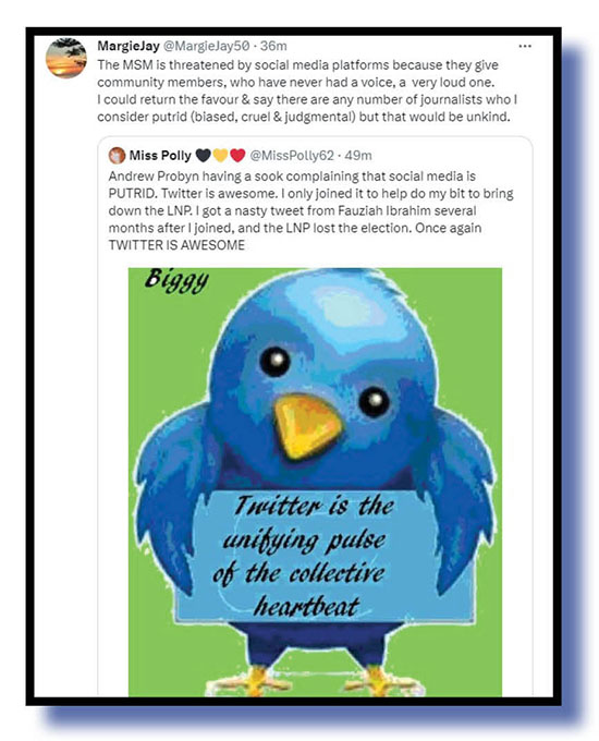 Can we just remind Probyn that the great majority of Australia’s mainstream media supported the return of the Morrison government. He can rail against Twitter as much as he likes, but if he thinks the MSM’s performance during that 2022 election period and since has been all tickety-boo and above board and the sector continues to show exemplary journalistic standards including the Cretin’s column at the top of this piece, then he’s a truly a lost cause.