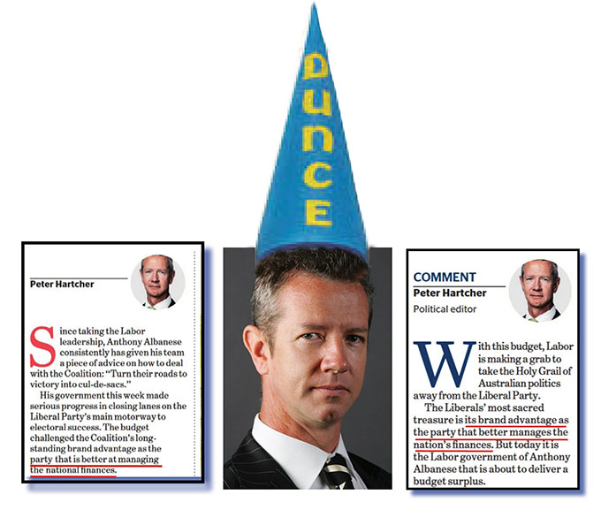 You’ve read right, BUGers. Very right. Last Wednesday, Hartcher wrote of the Liberals’ “most-sacred treasure”… “its brand advantage as the party that better manages the nation’s finances”. He repeated the claim last Saturday, with Labor’s budget having “challenged the Coalition’s (read Liberals) long-standing brand advantage as the party (told you he was thinking Liberals!) that is better at managing the national finances.