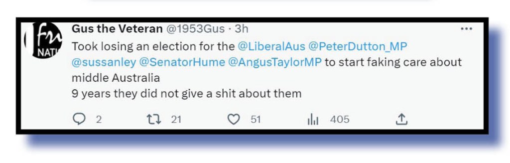 …while Gus the Veteran took a general swipe at the federal Opposition’s concern for middle Australia.