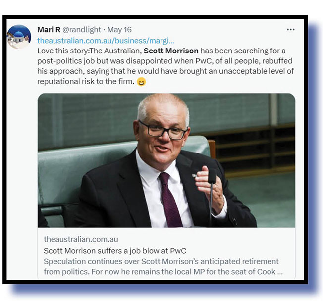 Our tweets-of-the-week judges accept that most Australians never, ever, want to hear of Scott Morrison ever again and the sooner some misguided overseas company lures him away from our shores never to be seen again the better!