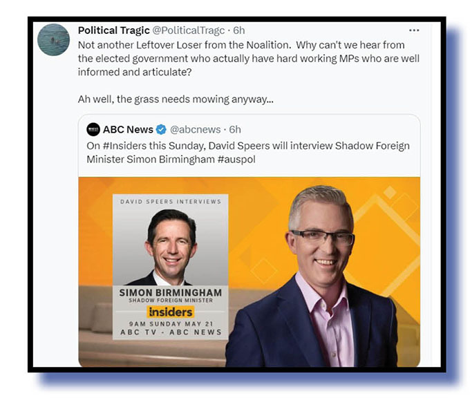 Okay, now for some media-focused contributions. Not that most of us need to find excuses for missing ABC’s Insiders of late, but Political Tragic found a good one.