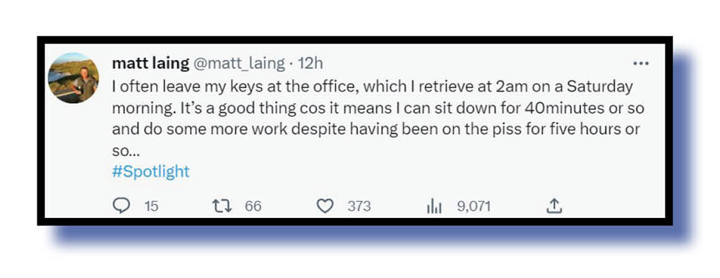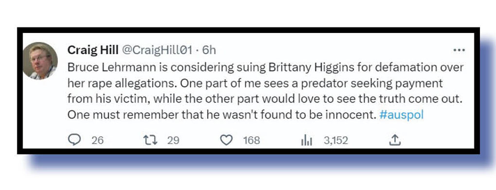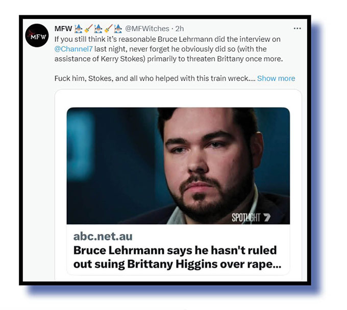 Okay, before we delve into the Twitterverse’s reaction to that Bruce Lehrmann protection racket – sorry, Channel 7’s Spotlight special and Lisa Wilkinson hatchet job last night – let’s feature a lighter tweet that caught our tweets-of-the-week judges’ fancy.