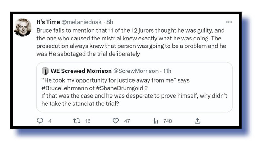 To be fair to Lehrmann, maybe he only heard the ACT chief copper’s view of where that jury was leading: a 10 to one split in favour of acquittal. The Bug suspects the holdout in that case was some fucking deadshit moronic juror clasping some dodgy “academic” papers on how often women who cry rape really were raped. (please insert prolonged and loud canned laughter here if you so desire).